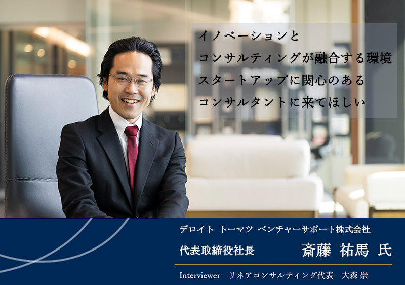スタートアップに対する資金調達やIPO支援、大手企業内の新規事業立ち上げ、さらには政府とのスタートアップ支援などを行うデロイト トーマツ ベンチャーサポート株式会社(以下DTVS)。代表取締役社長の斎藤氏は同社の特徴を「デロイトという看板がありながら、スタートアップの動きができる」と語る。 斎藤氏がベンチャー支援を志した経緯やキャリア、同社の事業、求める人物像についてうかがった。