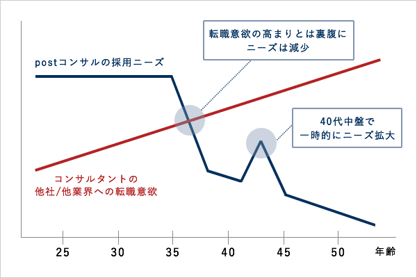 一方でコンサルティングファームでの現状の給与水準の高さが障壁となり、30代半ば以降ではPostコンサルの採用ニーズは右肩下がりとなっていきます。実際の事例としてもご本人の希望給与と企業からのオファー金額に大きく乖離があり、オファーを辞退される方も一定数いらっしゃいます。