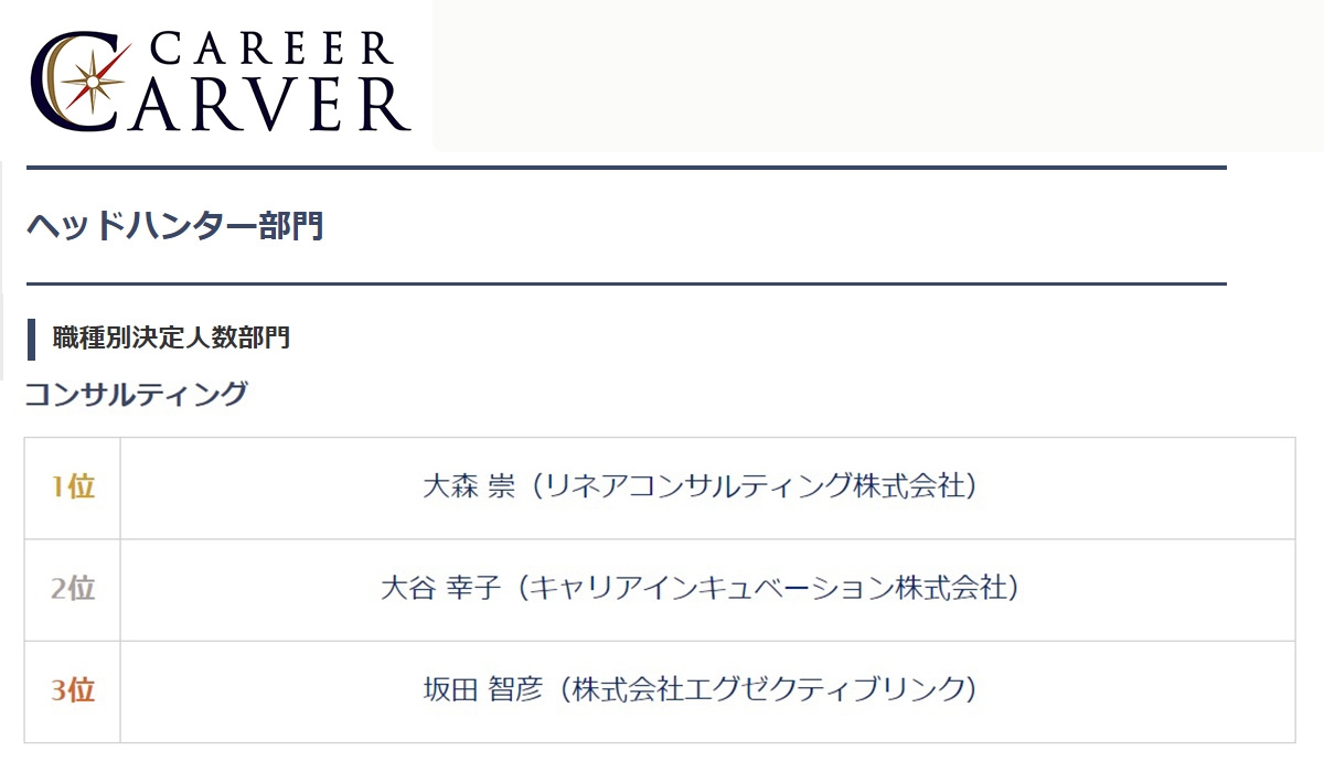 CAREERCARVERの【ヘッドハンター部門】職種別決定人数部門にて代表の大森が第1位を獲得しました。 詳細はこちら