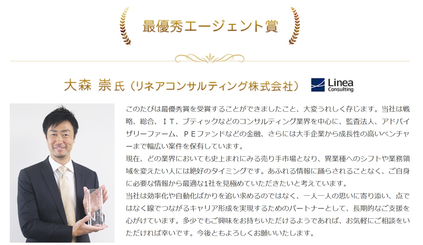 このたび、弊社代表大森が、 株式会社リクルートが展開するハイクラス転職・求人サービス、リクルートダイレクトスカウトが発表した 「ヘッドハンターランキング2022」にて表彰されました。 こちらは、リクルートダイレクトスカウトが、提携する約5,000名のヘッドハンターの中から、 転職支援の実績を元に、2022年に活躍したヘッドハンターを表彰するものです。 今回は「職種別決定人数部門(コンサルティング)1位」 及び「決定人数部門第3位」になります。 なお、職種別決定人数部門(コンサルティング)は2020年より連続受賞を頂いております。 今後とも、弊社ならびに大森は、ますます精進していく所存です。 引き続きよろしくお願いいたします。 掲載記事はコチラ
